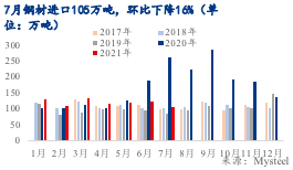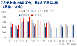 今年7月,我國(guó)鋼材出口566.9萬噸,環(huán)比下降87.9萬噸(12.2%),進(jìn)口鋼材104.9萬噸,環(huán)比下降20.3萬噸(16.2%)。