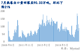 7月份,熱卷出口總量為90.33萬噸,環(huán)比上月下降24萬噸(21%),相較3、4月份出口高峰時(shí)期已經(jīng)減半,其主要原因是出口退稅取消后我國(guó)熱卷價(jià)格優(yōu)勢(shì)減弱。