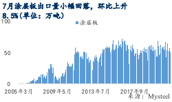 考慮到目前冷軋、涂鍍板的價(jià)格優(yōu)勢(shì)仍在,預(yù)計(jì)出口量下降幅度要小于熱卷。假設(shè)下月出口量延續(xù)7月降幅,那么8月涂層板、鍍層板出口量將分別降至44萬噸、130萬噸,分別環(huán)比下降6萬噸、13萬噸。