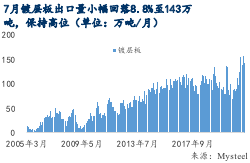 6月冷軋出口量受退稅政策調(diào)整前“搶出口”影響,創(chuàng)歷史新高,7月該影響持續(xù),冷軋板卷出口78.6萬噸,環(huán)比6月下降12.6萬噸(13.8%),但仍然處于較高水平。