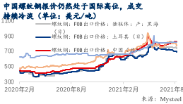 另外,目前多家生產(chǎn)熱卷的大型國(guó)有鋼廠已接到通知,不再向外出口熱軋板卷。目前,僅有少數(shù)大型鋼廠對(duì)外報(bào)價(jià),且報(bào)價(jià)要高于越南、印度、俄羅斯等國(guó)。另外,受到海外疫情持續(xù)爆發(fā),以及陸續(xù)傳出的出口加征關(guān)稅傳言影響,市場(chǎng)整體恐慌情緒濃厚,海外買家采購(gòu)較為謹(jǐn)慎,成單較少。