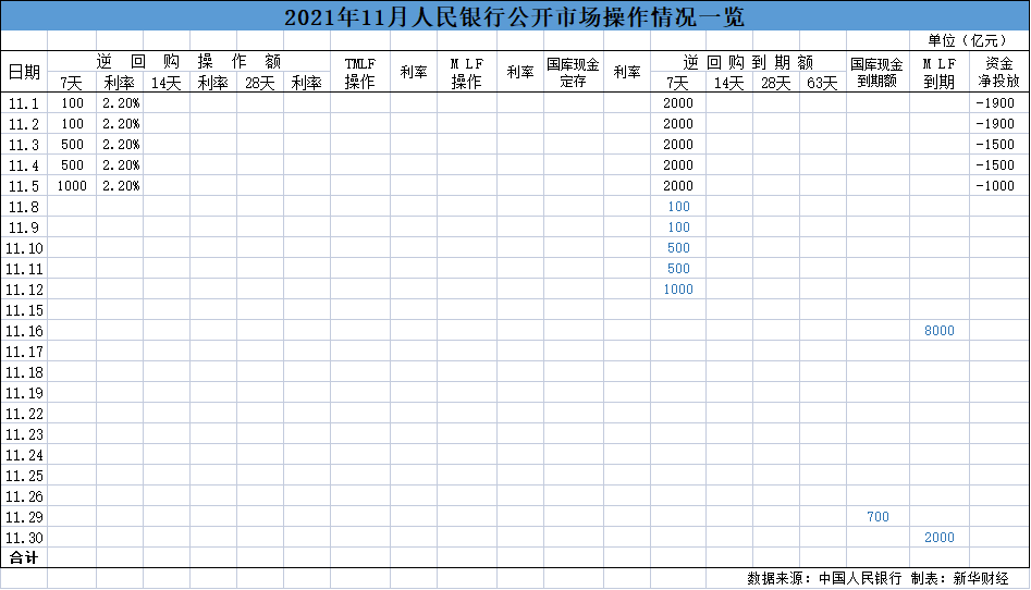至此,11月首周(1日-5日)央行累計開展2200億元逆回購操作,其中周一至周五“逐級放量”,分別為100億、100億、500億、500億、1000億元,鑒于當周有10000億元逆回購到期,公開市場合計凈回籠7800億元。
